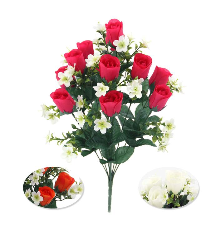 BQT DE 12 BOUTONS DE ROSES ET MINIS FLEURS H46CM 3 COULEURS